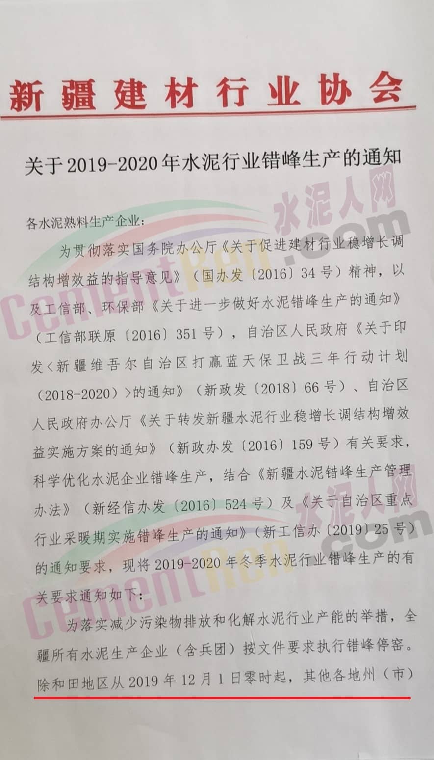 近日,新疆建材行業協會發布了《關于2019-2020年水泥行業錯峰生產的通知》稱,為貫徹落實國務院辦公廳《關于促進建材行業穩增長調結構增效益的指導意見》(國辦發〔2016)34號)精神,以及工信部、環保部《關于進一步做好水泥錯峰生產的通知》(工信部聯原(2016〕351號),自治區人民政府《關于印發<新疆維吾爾自治區打贏藍天保衛戰三年行動計劃(2018-2020)>的通知》(新政發(2018) 66號)、自治區人民政府辦公廳《關于轉發新疆水泥行業穩增長調結構增效益實施方案的通知》(新政辦發(2016)159號)有關要求,科學優化水泥企業錯峰生產,結合《新疆水泥錯峰生產管理辦法》(新經信辦發(2016)524號)及《關于自治區重點行業采暖期實施錯峰生產的通知》(新工信辦〔2019〕25號)的通知要求,現將2019-2020年冬季水泥行業錯峰生產的有關要求。