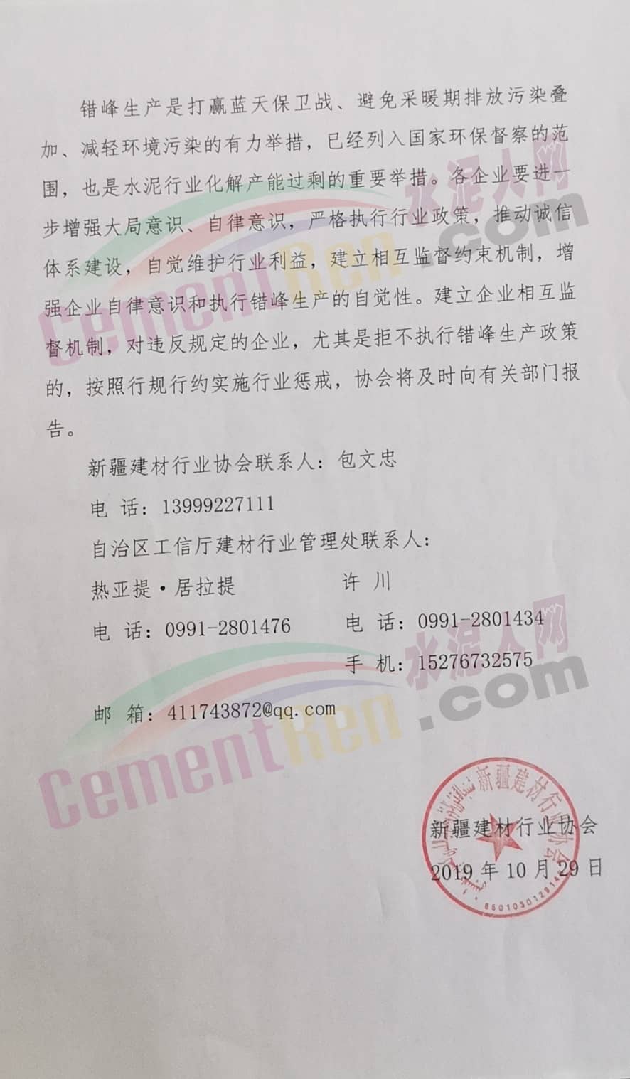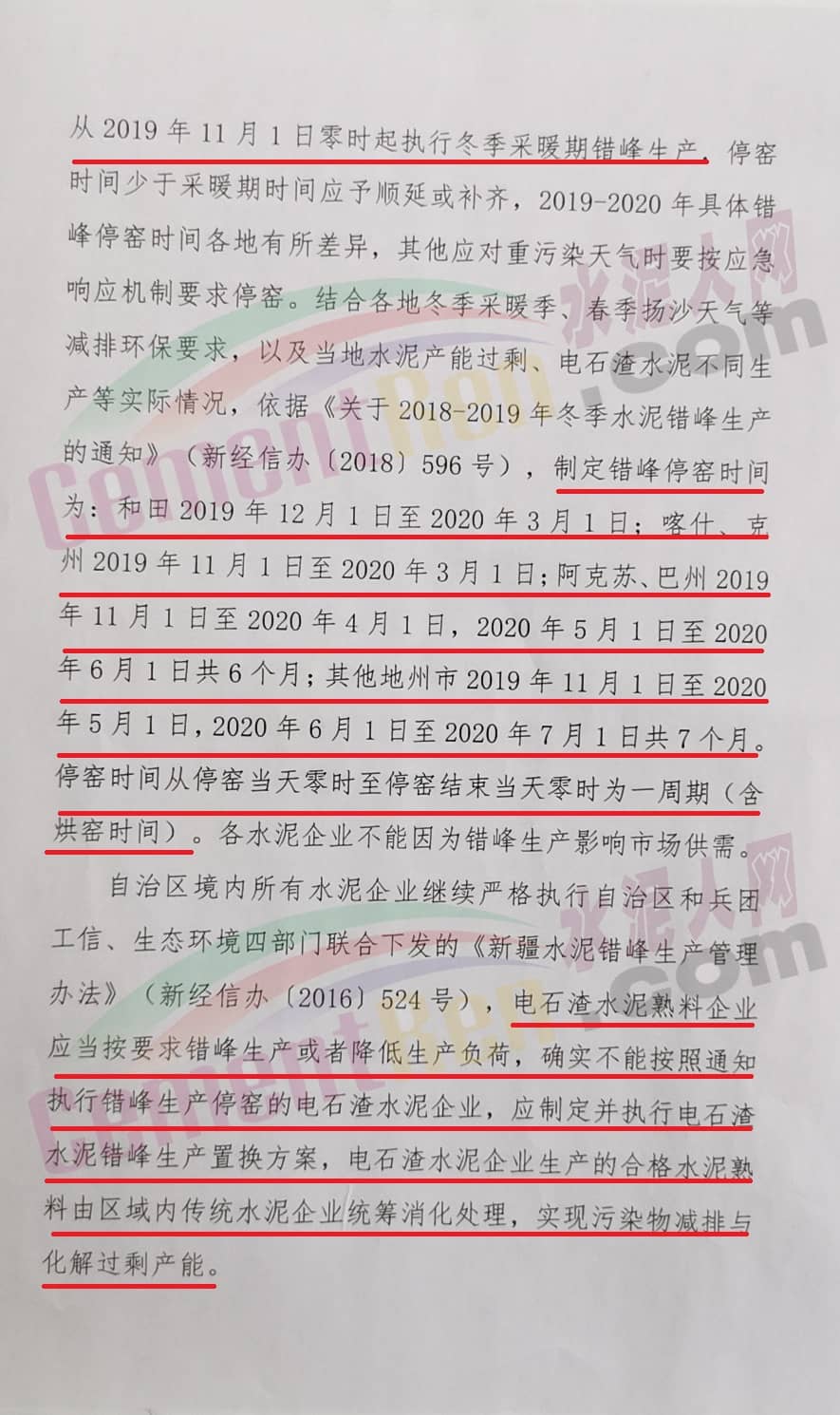為落實減少污染物排放和化解水泥行業產能的舉措,全疆所有水泥生產企業(含兵團)按文件要求執行錯峰停容。除和田地區從2019年12月1日零時起,其他各地州(市)從2019年11月1日零時起執行冬季采暖期錯峰生產,停容時間少于采暖期時間應予順延或補齊,2019-2020年具體錯峰停容時間各地有所差異,其他應對重污染天氣時要按應急響應機制要求停容。結合各地冬季采暖季、春季揚沙天氣等減排環保要求,以及當地水泥產能過剩、電石享水泥不同生產等實際情況。