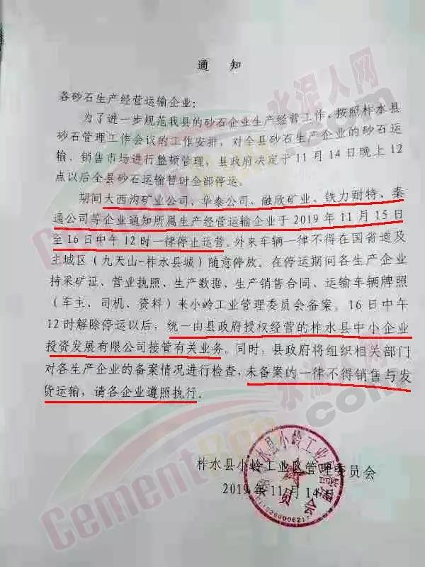陜西省商洛市柞水縣小嶺工業區管理委員會發通知給砂石生產經營運輸企業稱,為進一步規定縣域境內的砂石企業生產經營工作。按照縣砂石管理工作會議的工作安排 ,對全縣砂石生產企業的砂石運輸,銷售市場進行整頓管理。縣政府決定于11月14日晚上12時以后全縣砂石運輸暫時全部停運。