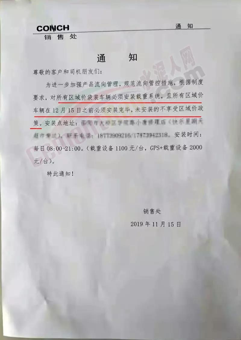 日前,海螺水泥湖南紹陽公司通知為進一步強強產品流向管理,規范流向管控措施,根據制度要求,對所有區域價袋裝車輛必須安裝載重系統,且所有區域價車輛在下月15日前必須安裝完畢,未安裝的不享受區域價政策。其中載重設備1100元/臺,GPS+載重設備2000元/臺。