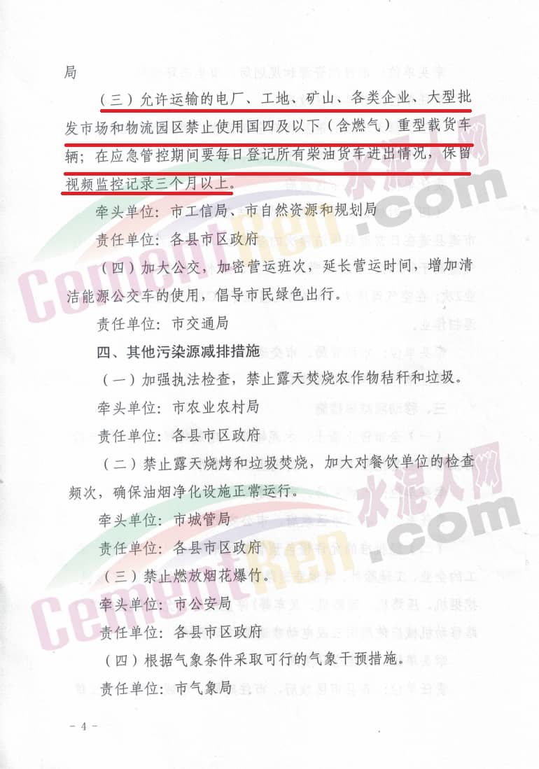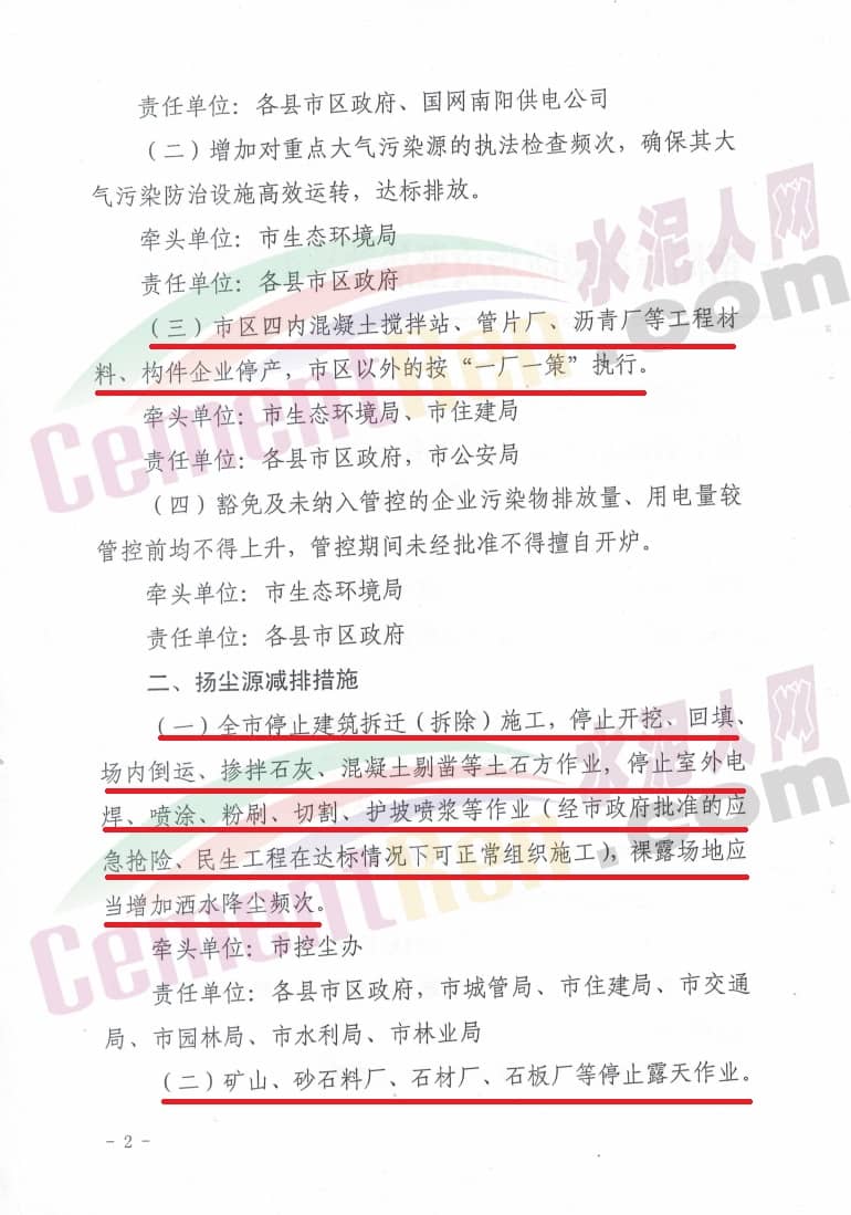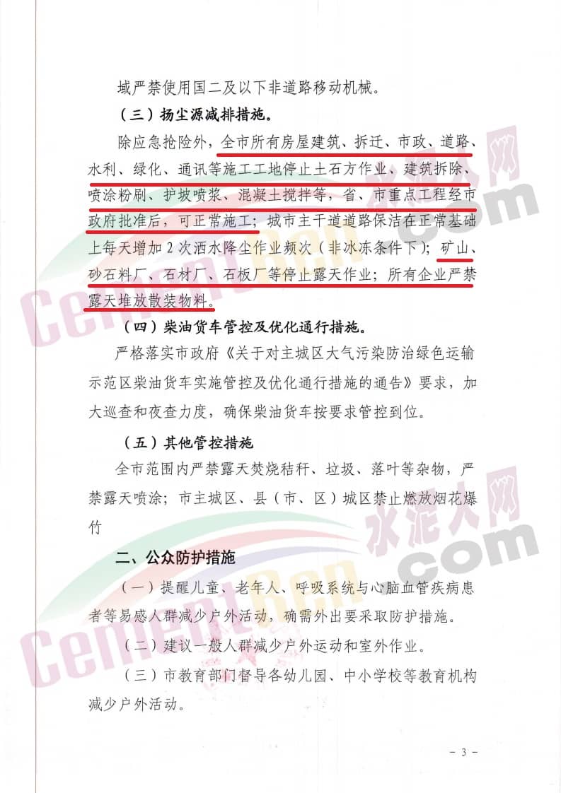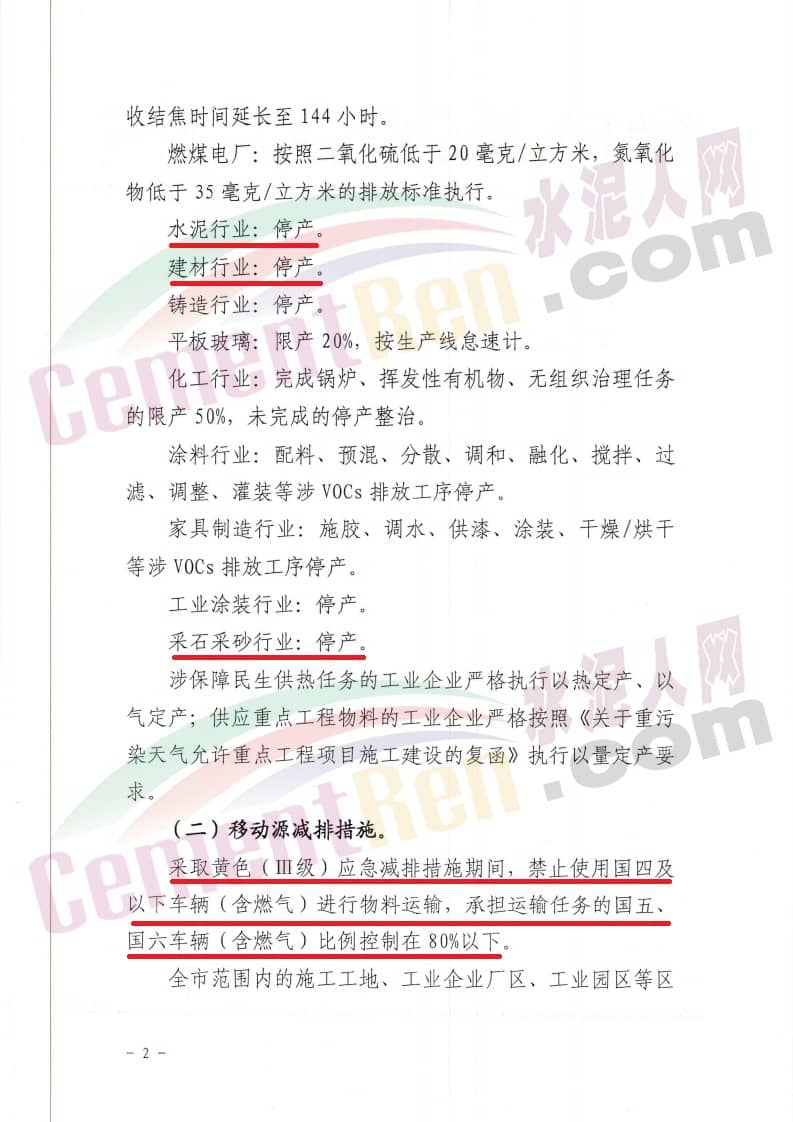 工業企業必須嚴格落實新修訂的應急減排措施清單中停限產措施,建材行業全部停產(包括水泥行業、采石采砂行業等),涉保障民生供熱任務的工業企業嚴格執行以熱定產、以氣定產;供應重點工程物流的工業企業嚴格按照《關于重污染天氣允許重點工程項目施工建設的復函》執行以量定產要求。