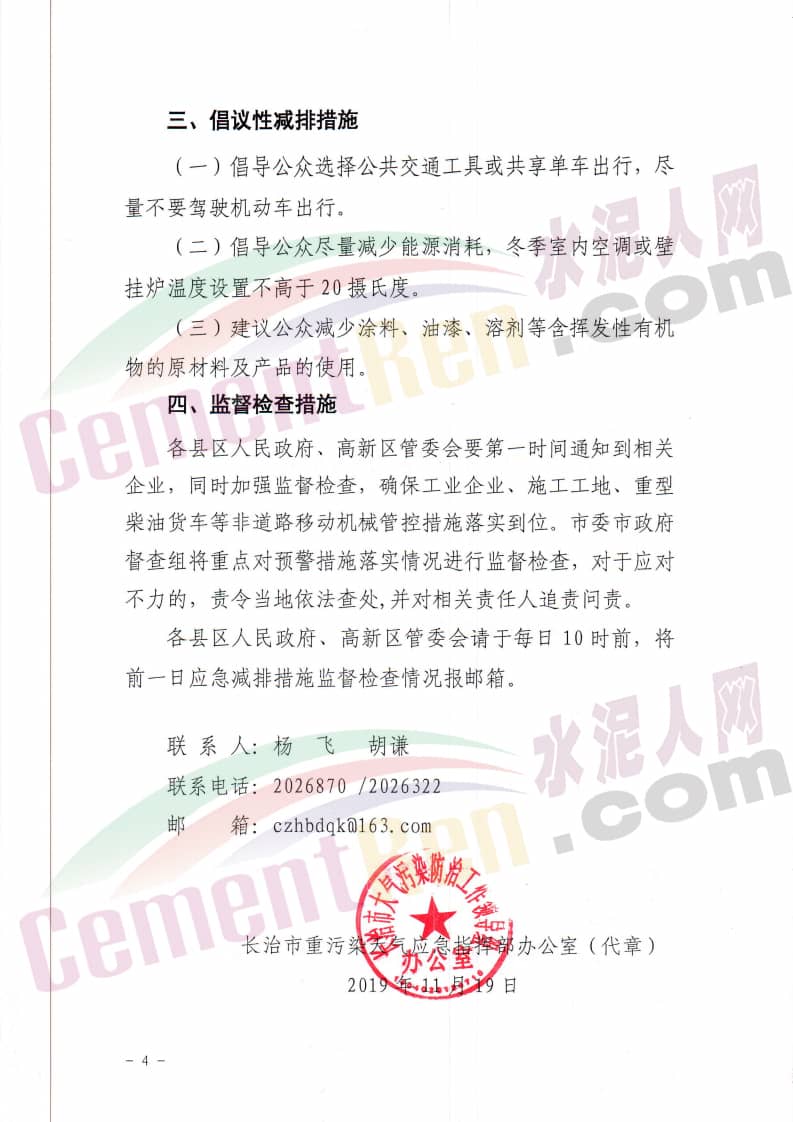 11月18日,山西省大氣污染防治工作領導組辦公室發布了《應對重污染天氣調度令》稱,根據山西省環境空氣質量實時監測數據、氣象數據以及與中國環境監測總結、省氣象相關部門會商預測,11月20日-22日,濕度較大,擴散條件逐步轉差,全省范圍可能出現一次中度及以上污染過程,影響范圍包括太原、晉中、臨汾、晉城、運城、長治等城市,22日夜間至23日上午污染最重,PM2.5濃度峰值可達180-220微克/立方米;23日午后、受冷空氣影響,空氣質量自北向南逐漸好轉,太原、晉中、臨汾、晉城、運城、長治及忻州“1+30”區域,呂梁“1+30”區域于11月20日0時至23日24時,啟動黃色已經措施。應急減排措施以長治市為例,減排措施如下: