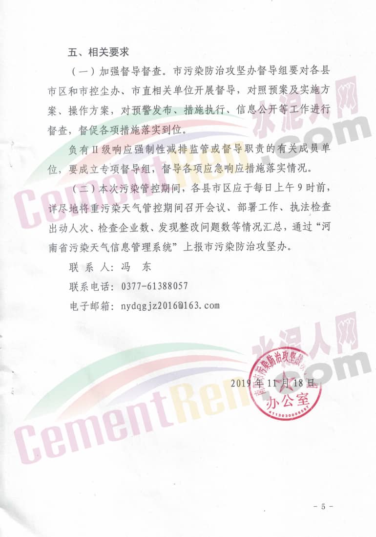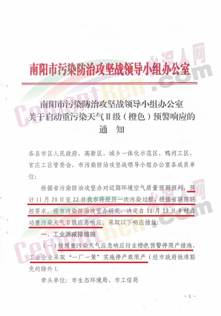 11月18日河南省南陽市相繼發布了《關于啟動重污染天氣二級(橙色)預警響應的通知》稱根據省污染防治攻堅辦對近期的環境空氣質量預測預判,預計11月20日至22日南陽市將經理一次污染過程,根據省聯防控要求,經市污染防控攻堅辦研究,決定自11月19日0時啟動重污染天氣二級應急響應,具體減排措施如下: