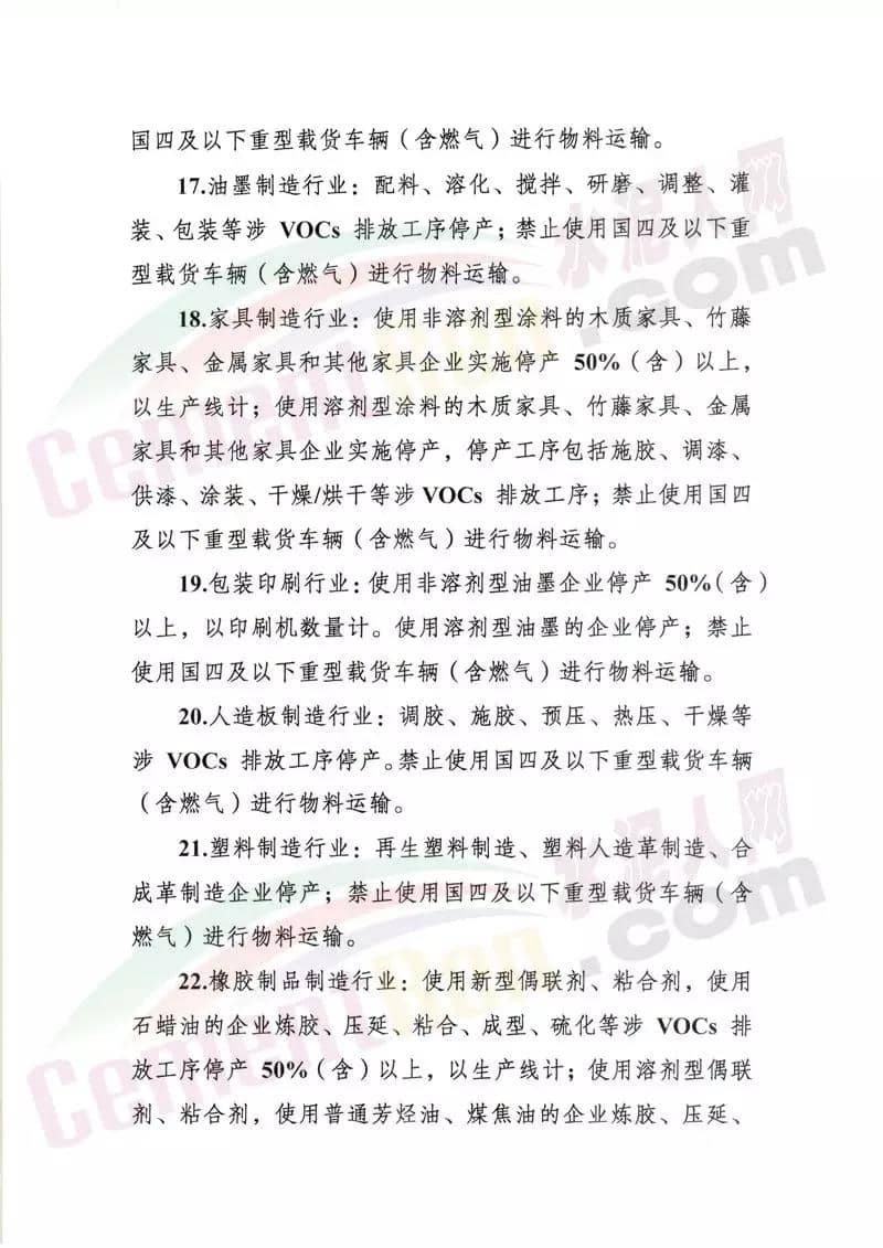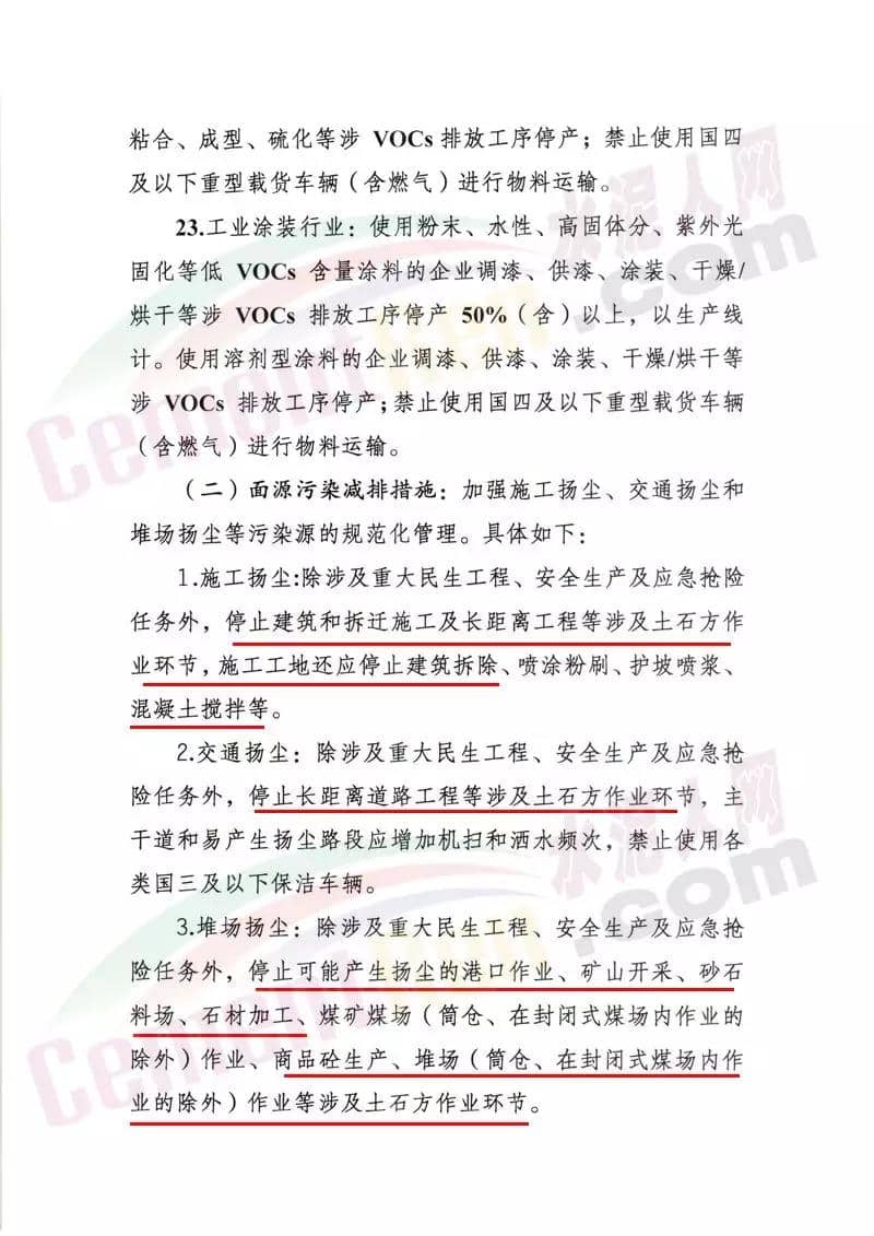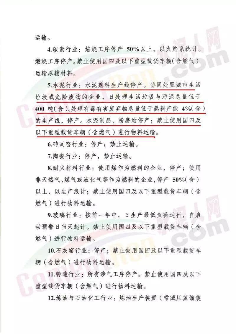 水泥行業,水泥熟料生產線停產。協同處置城市生活垃圾或危險廢物的企業,日處理生活垃圾與污染總量低于400噸(含)、處理有毒有害廢棄物總量低于熟料產能4%(含)的生產線,停產。水泥制品、粉磨站停產;禁止使用國四及以下重型載貨車輛(含燃氣)進行物料運輸。