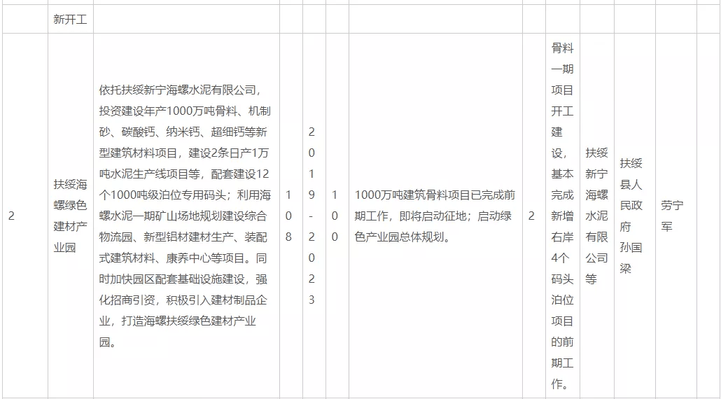 項(xiàng)目內(nèi)容顯示,扶綏海螺綠色建材產(chǎn)業(yè)園項(xiàng)目主要是依托依托扶綏新寧海螺水泥有限公司,投資建設(shè)年產(chǎn)1000萬噸骨料、機(jī)制砂、碳酸鈣、納米鈣、超細(xì)鈣等新型建筑材料項(xiàng)目,建設(shè)2條日產(chǎn)1萬噸水泥生產(chǎn)線項(xiàng)目等,配套建設(shè)12個(gè)1000噸級泊位專用碼頭;