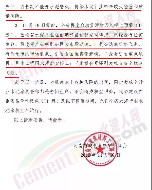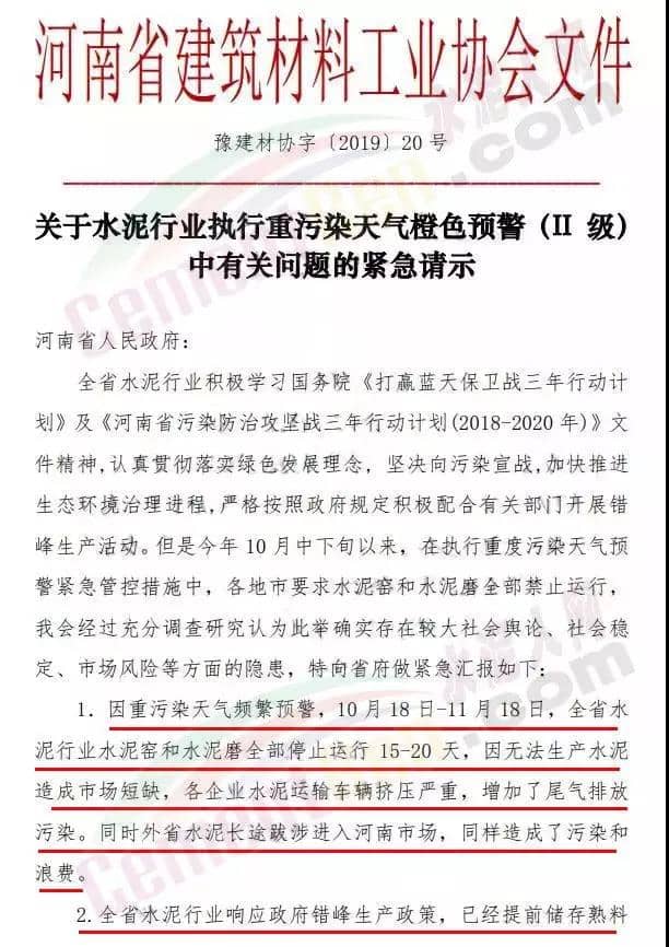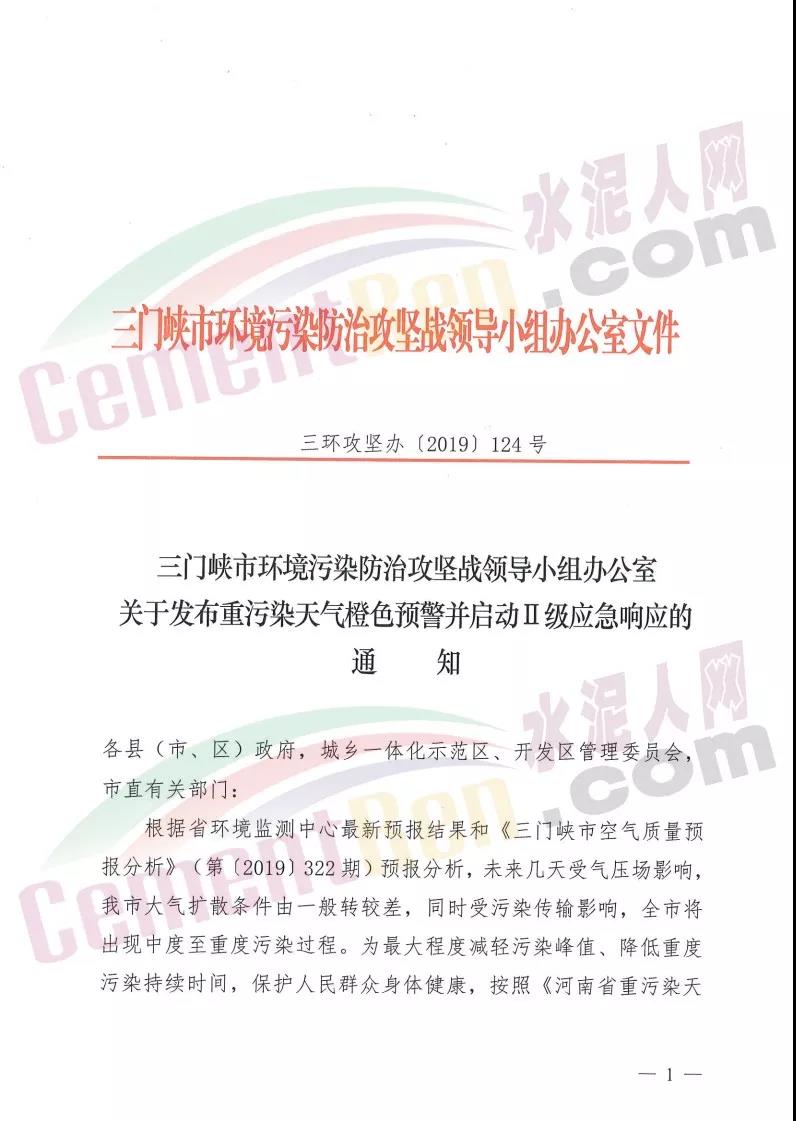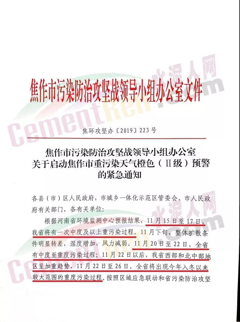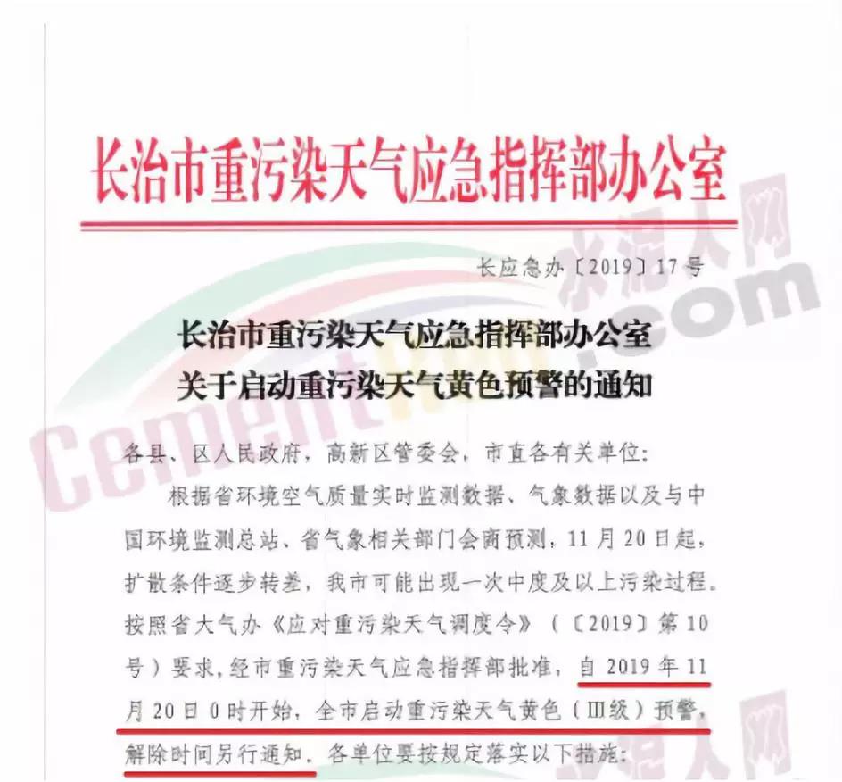 長治市重污染天氣應急指按部辦公室通知文件要求自11月20日0時開始全市啟動重污染天氣黃色(III級)預警,要求水泥、建材行業停產。
