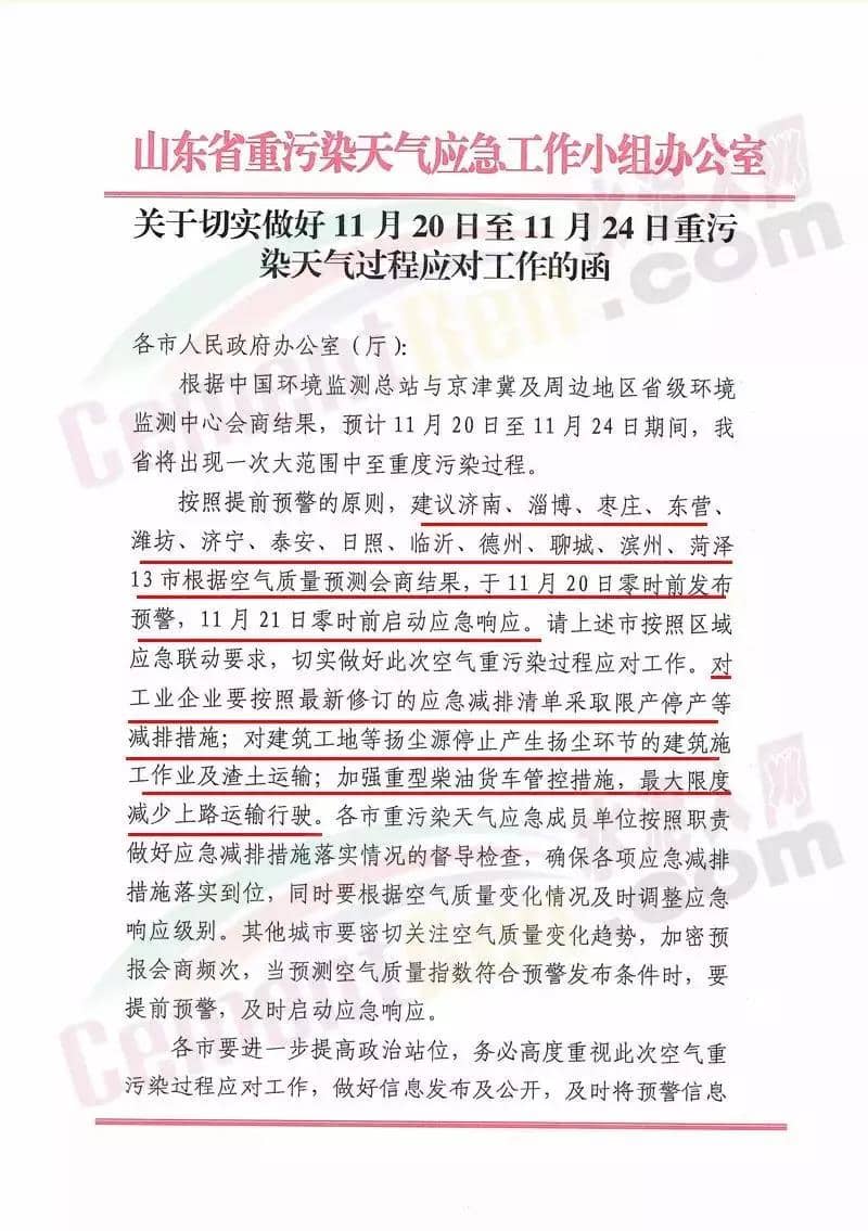 11月19日山東省重污染天氣應急工作小組辦公室發布通知,建議濟南、淄博 、棗莊、東營、維坊、濟寧、泰安、日照、臨沂、德州、聊城、濱州、菏澤13市根據空氣質量預測會商結果,于11月20日零時前發布預警,11月21日零時前應動應急響應。預警期間對工業企業要按照最新修訂的應急減排清單采取限產停產等減排措施;對建筑 工地等揚塵源停止產能揚塵環節的建筑施工作業及渣土運輸;加強重型柴油貨車管控措施,最大限度減少上路運輸行駛等。
