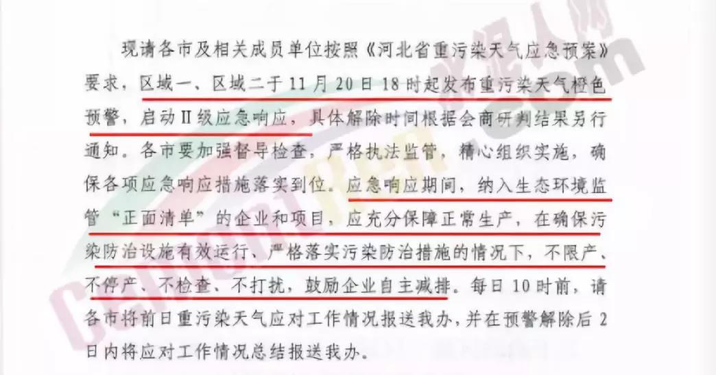 河北省大氣污染防治工作領導小組辦公室通知文件稱要求區域一(石家莊、保定、衡水、邢臺、邯鄲、定州、辛集、雄安新區)、區域二(唐山、廊坊、滄州、秦皇島)將于11月20日18時起發布重污染天氣橙色預警,啟動II級應急響應。應急響應期間,納入生態環境監管“正面清單”的企業和項目,應充分保障正常生產,在確保污染防治設施有效運行、嚴格落實污染防治措施的情況下,不限產、不停產、不檢查、不打擾,鼓勵企業自主減排。