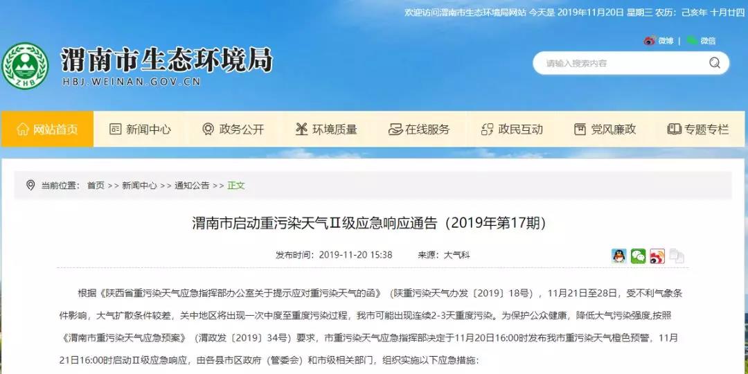 陜西省西安市重污染天氣應急指揮部辦公室11月20日發布重污染天氣橙色預警,從2019年11月20日16時起啟動Ⅱ級應急響應。