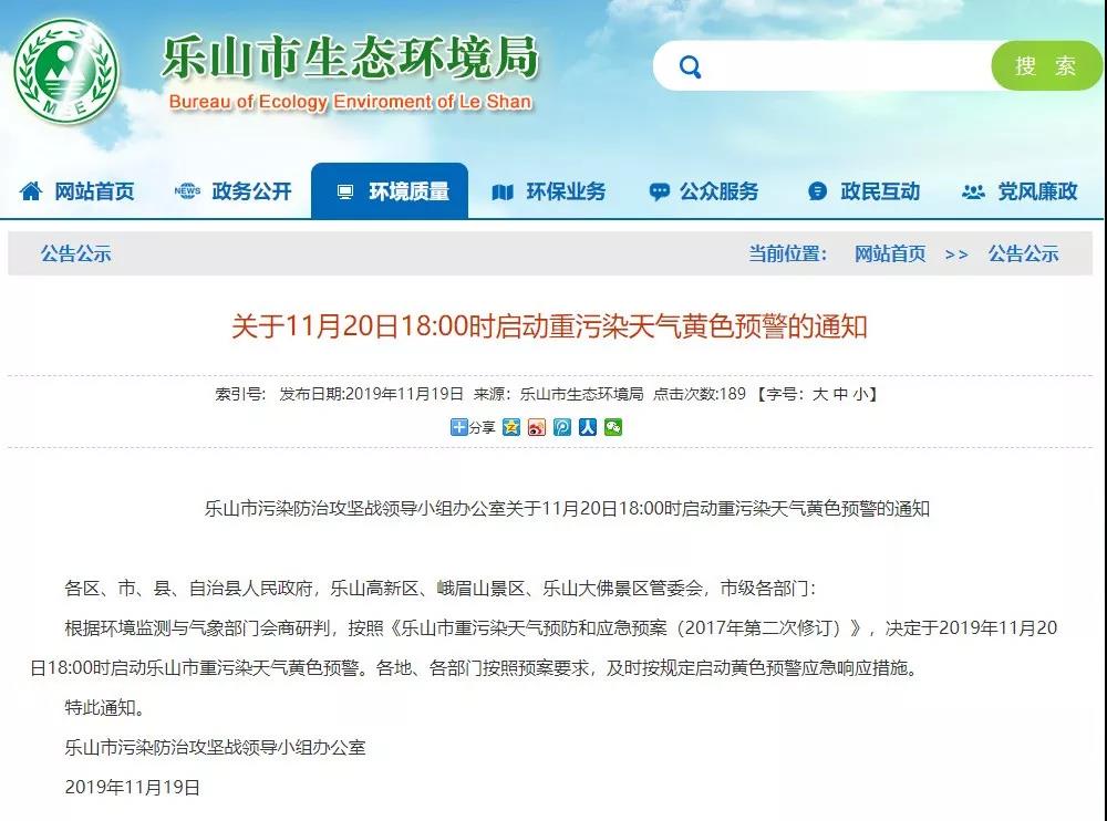 11月19日樂山市污染防治攻堅戰領導小組辦公室布《關于11月20日18:00時啟動重污染天氣黃色預警的通知》稱:根據環境監測與氣象部門會商研判,按照《樂山市重污染天氣預防和應急預案(2017年第二次修訂)》,決定于2019年11月20日18:00時啟動樂山市重污染天氣黃色預警。各地、各部門按照預案要求,及時按規定啟動黃色預警應急響應措施。