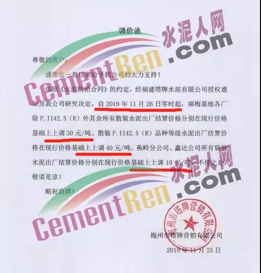 梅州市塔牌營銷有限公司發布了調價函稱,依照《水泥購銷合同》的約定,決定自2019年11月26日零時起,福梅基地各廠除P.II42.5(R)外其余所有散裝水泥出廠結算價格在現行價格基礎上上調30元/噸,散裝P.II42.5(R)品種等級水泥出廠結算價格在現行價格基礎上上調40元/噸,蕉嶺分公司、鑫達分公司所有袋裝水泥出廠結算價格分別在現行價格基礎上上調10元/噸。