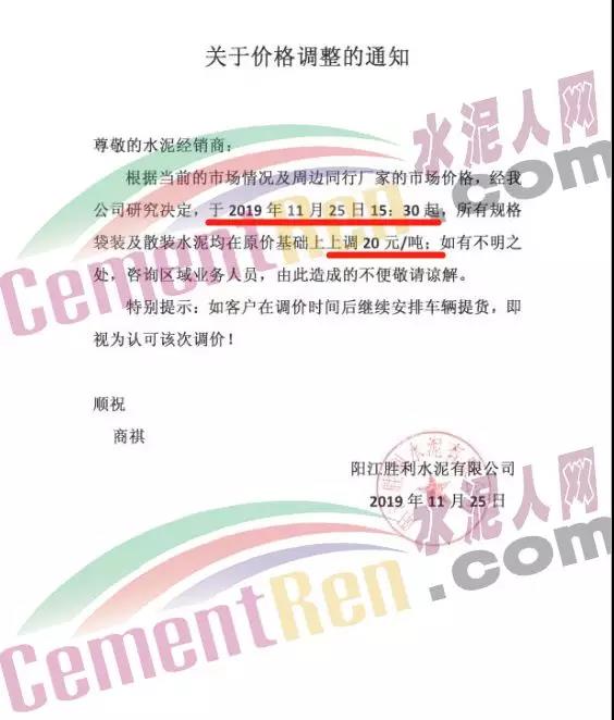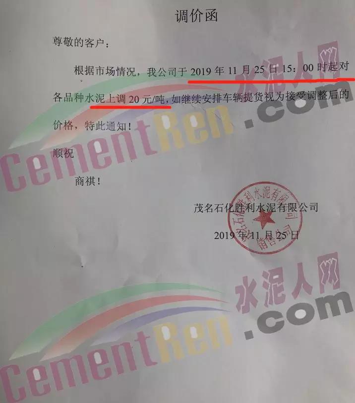 茂名石化勝利水泥有限公司發布了調價函稱,根據市場情況,于2019年11月25日15:00時起對品種水泥上調20元/噸。