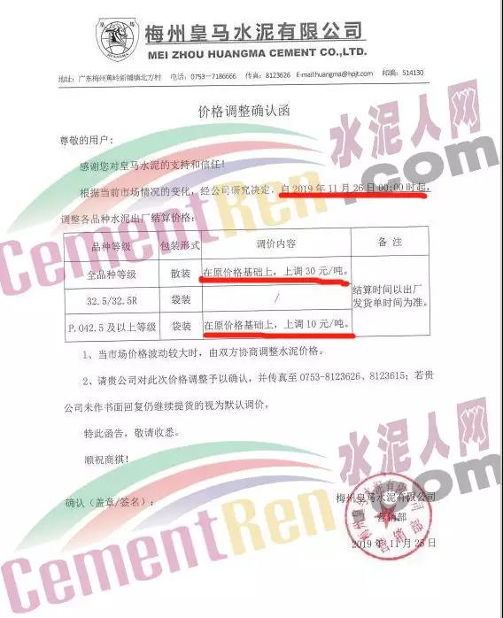 梅州市皇馬水泥有限公司發布了價格調整確認函,根據當前市場情況變化,決定自2019年11月26日00:00時起,全品種等級散裝在原價基礎上,上調30元/噸,P.O42.5及以上等級袋裝在原價格基礎上,上調10元/噸。