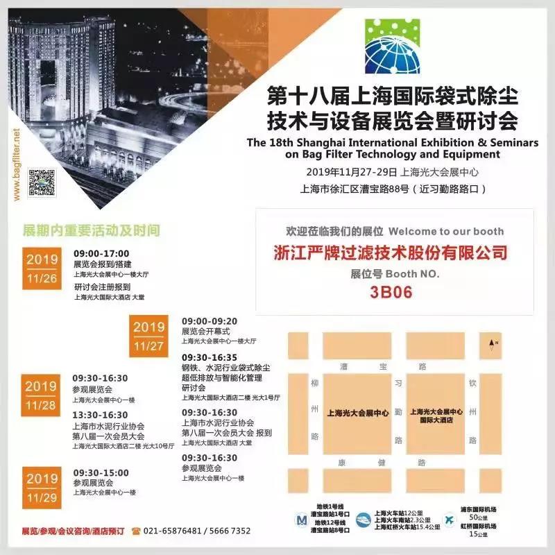 ▲嚴牌成為“垃圾焚燒技術與裝備國家工程實驗室”成員單位 據水泥人網了解,在不斷加強技術研發水平的提升,企業的技術研發實力已經達到了國內先進水平,嚴牌股份也先后被認定為國家高新技術企業,浙江省企業技術中心、浙江省創新型示范中小企業,浙江省“隱形冠軍”企業,浙江省管理創新試點企業,浙江省清潔生產階段性成果企業,浙江省高新技術企業研究開發中心,浙江工業名牌產品等。延伸閱讀: 11月27日-29日,嚴牌股份將參與“第十八屆上海國際袋式除塵技術與裝備展覽會”,誠邀您蒞臨現場參觀指導!展位號:3B06展會地點:上海光大會展中心(參展信息見下圖)