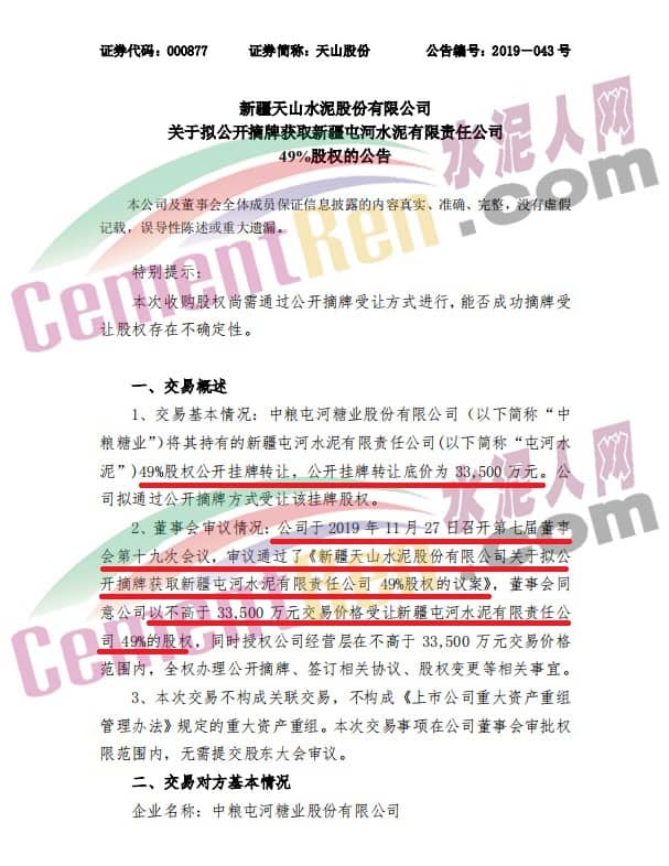 據(jù)了解,天山股份于2019年11月27日召開第七屆董事會第十九次會議,審議通過了《新疆天山水泥股份有限公司關(guān)于擬公開摘牌獲取新疆屯河水泥有限責(zé)任公司49%股權(quán)的議案》,董事會同意公司以不高于33500萬元交易價(jià)格受讓新疆屯河水泥有限責(zé)任公司49%的股權(quán),同時(shí)授權(quán)公司經(jīng)營層在不高于33500萬元交易價(jià)格范圍內(nèi),全權(quán)辦理公開摘牌、簽訂相關(guān)協(xié)議、股權(quán)變更等相關(guān)事宜。