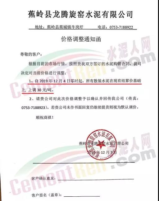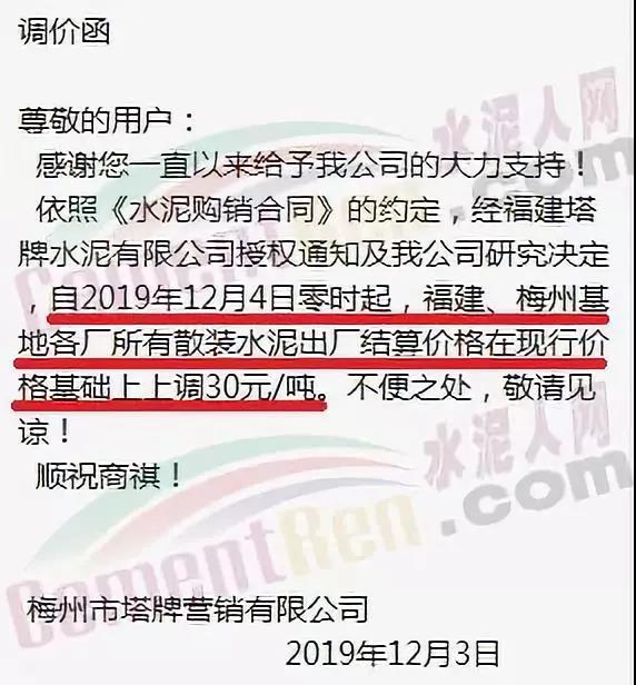 依照《水泥購銷合同》的約定,經福建塔牌水泥有限公司授權通知及我公司研究決定,自2019年12月4日零時起,福建、梅州基地各廠所有散裝水泥出廠結算價格在現行價格基礎上上調30元/噸。不便之處,敬請見諒!
