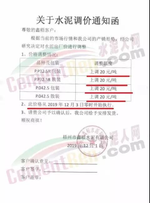 華潤水泥廣西市場部梧州區域發通知稱, 根據當前市場形勢及產銷存實際情況,經公司研究決定,定于2019年12月3日00:00起對袋裝、散裝各品種水泥價格上調20元/噸。