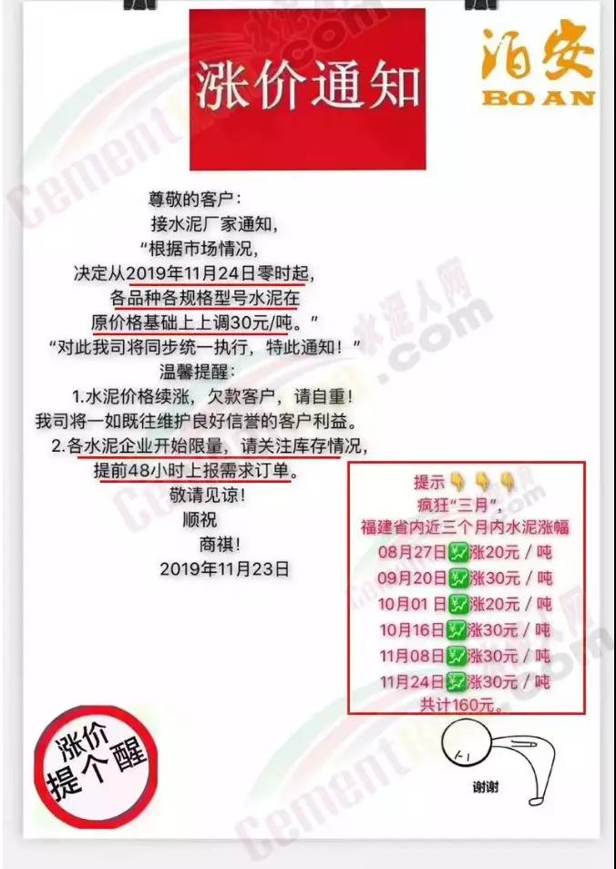 11月23日,福建泊安水泥的漲價(jià)通知稱(chēng),根據(jù)市情況從11月24日零時(shí)起,各品種各規(guī)格水泥在原價(jià)格基礎(chǔ)上上調(diào)30元/噸。自此,福建省內(nèi)近三個(gè)月內(nèi)水水泥水泥連漲六波,累計(jì)漲價(jià)達(dá)160元/噸。