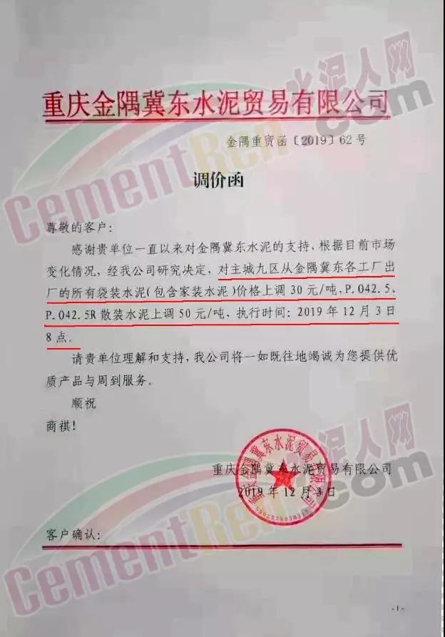 重慶金隅冀東水泥貿(mào)易有限公司調(diào)價(jià)函稱(chēng),根據(jù)目前市場(chǎng)變化情況經(jīng)公司研究決定 ,對(duì)主城九區(qū)從金隅冀東各工廠出廠的所有袋裝水泥(包含家裝水泥)價(jià)格上調(diào)30元/噸,PO42.5、PO42.5R散裝水泥上調(diào)50元/噸,執(zhí)行時(shí)間12月3日早8時(shí)。