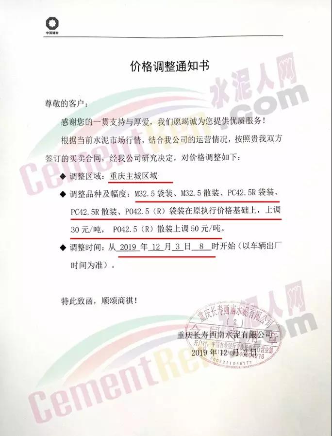重慶長(zhǎng)壽西南水泥調(diào)價(jià)通知書(shū)稱(chēng),根據(jù)當(dāng)前水泥市場(chǎng)行情,結(jié)合公司運(yùn)營(yíng)情況,經(jīng)公司研究決定自12月3日時(shí)對(duì)重慶主城區(qū)M32.5袋/散,PC42.5R袋/散、PO42.5(R)袋裝在原執(zhí)行價(jià)格基礎(chǔ)上上調(diào)30元/噸,PO42.5(R)散裝上調(diào)50元/噸。