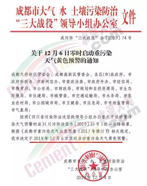 昨日(12月4日),四川省污染防治攻堅戰領導小組辦公室發布了“關于啟動重污染天氣預警的函”:根據四川省生態環境監測總站與省氣象臺聯合會商,近期四川省盆地大部分城市氣象條件轉差,12月6日至11日將出現一次區域性天氣污染過程,成都平原、川南部分城市及川東北局部城市可能出現輕度至中度污染,短時出現重度污染。成都市大氣、水、土壤污染防治“三大戰役”領導小組辦公室發出通知,稱按照相關規定“成都市定于2019年12月6日零時啟動重污染天氣黃色預警。”這也是成都今冬首個重污染天氣黃色預警。