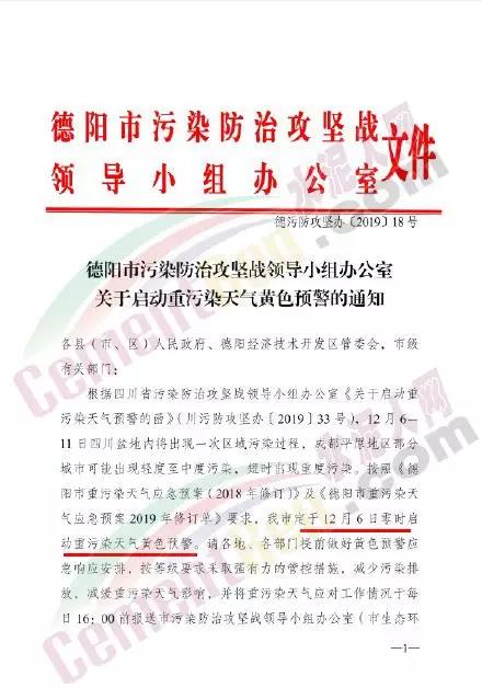 四川省德陽市定于12月6日零點啟動重污染天氣黃色預警。屆時有關部門將按照等級要求采取管控措施,減少污染物排放。