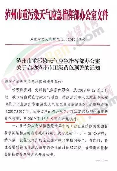 12月3日,四川省瀘州市重污染天氣應急指揮部辦公室發布《關于啟動瀘州市Ⅲ級黃色預警的通知》。從2019年12月5日起,瀘州市將出現重污染天氣過程,按照瀘州市人民政府辦公室《關于印發瀘州市重污染天氣應急預案的通知》(瀘市府辦函〔2017〕317號)及修訂單的有關規定,決定啟動瀘州市Ⅲ級黃色預警。