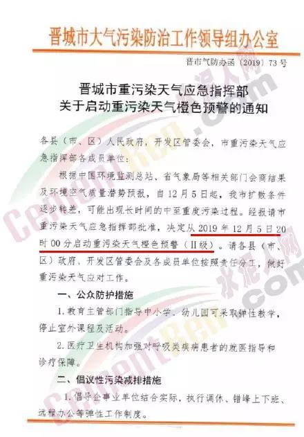 12月4日,,山西晉城市重污染天氣應急指揮部辦公室發布《晉城市重污染天氣應急指揮部關于啟動重污染天氣橙色預警的通知》,根據中國環境監測總站,省氣象局等相關部門會商結果及環境空氣質量潛勢預報,自12月5日起,晉城市擴散條件逐步轉差,可能出現長時間的中至重度污染過程。經報請市重污染天氣應急指揮部批準,決定從2019年12月5日20:00啟動重污染天氣橙色預警(II級)。
