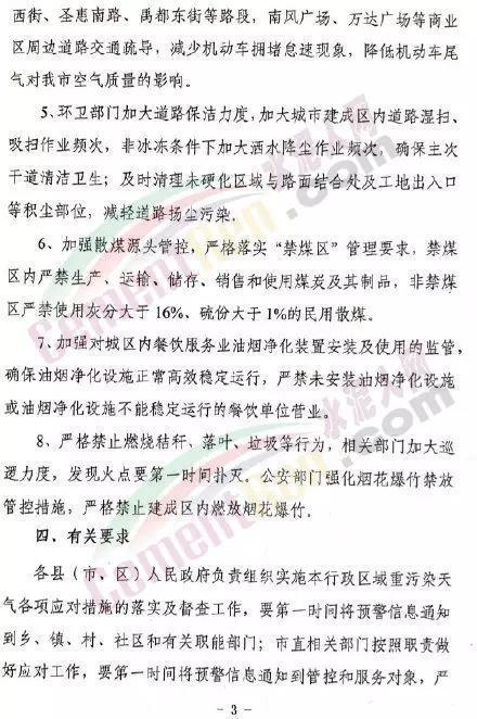 日前,河南省污染防治攻堅戰領導小組辦公室發布了《關于加強重污染天氣應急管控工作的通知》稱,根據省環境監測中心最新預報結果,12月4日至10日,全省擴散條件轉差,將出現較大范圍的重污染天氣過程。其中鄭州、開封、洛陽、平頂山、安陽、鶴壁、新鄉、焦作、濮陽、許昌、漯河污染聚集時間較長,重度污染過程持續3-4天,部分時段將出現嚴重污染。商丘、周口、南陽將持續出現3天中度及以上污染過程。為加強聯防聯控,減輕區域重度污染程度,縮短重污染持續時間,保護人民群眾身體健康,根據《河南省重污染天氣應急預案 》要求,建議鄭州、平頂山、焦作、許昌、周口、駐馬店、南陽及濟源示范區于12月4日0時啟動重污染天氣橙色及以上級別預警;開封、洛陽、安陽 、鶴壁、新鄉、濮陽、漯河、三門峽、商丘根據當前環境空氣質量變化形勢,繼續實行重污染天氣橙色及以上級別預警響應。各地要對照《關于加強重污染天氣應對劣實應急減排措施的指導意見》及重污染天氣應急減排清單要求,落實好各項應急減排措施,對已列入重污染天氣績效分級A、B級、保障民生、戰略性和新興產業相關的行業企業在確保污染物穩定達標排放,污染防治設施齊全并正常運行的前提下實施自主減排。同時要求各地要持續不間斷開展好督查核查工作,根據省污染防治攻堅辦每日通報的各地管控情況 ,加大督查 力度和督辦深度,尤其是污染較重區域,用電量異常,在線監管污染物排放超標企業等將逐一跟蹤督辦,對管控措施落實不到位,督導不力的地方,派出暗訪組現場核查,對管控不力,造成空氣質量嚴重反彈的地方,進行通報批評,追究有關責任人的責任,并在媒體曝光。通知原文如下:
