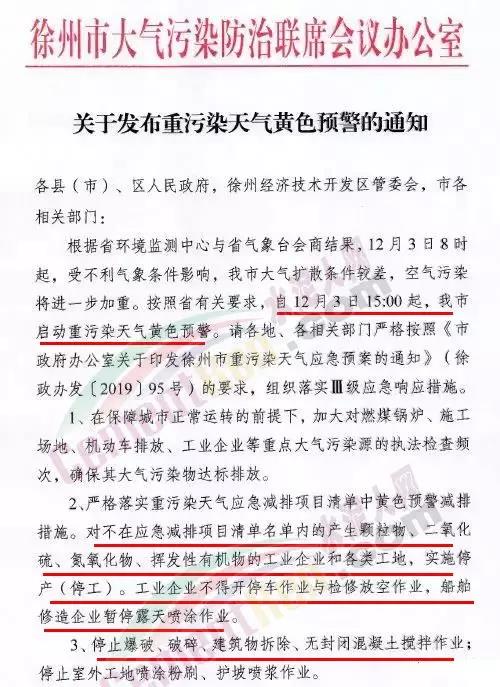 經江蘇省環境監測中心與省氣象臺會商,受不利氣象條件影響,全省大氣擴散條件較差,截至12月3日8時,沿江8市空氣質量以中度—重度污染為主,其他城市以輕度污染為主,預計空氣質量將維持或進一步加重,達到《江蘇省重污染天氣應急預案》黃色預警的啟動條件。自12月3日12時起,南京、無錫、徐州、常州、蘇州、南通、淮安、揚州、鎮江、泰州和宿遷11市啟動重污染天氣黃色預警。按照省有關要求,自12月3日15:00起,江蘇省徐州市啟動重污染天氣黃色預警。