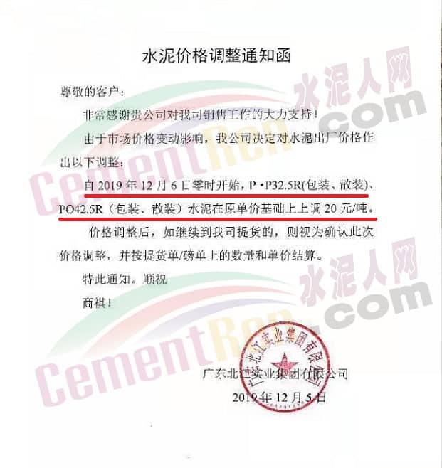 日前,廣東北江實業集團有限公司發調價通知稱,由于市場價格變動影響,公司決定 對水泥出廠價格做出調整。自12月6日零時開始P.P32.5R(包、散裝)、PO42.5R(包裝、散裝)水泥在原單價基礎上上調20元/噸。