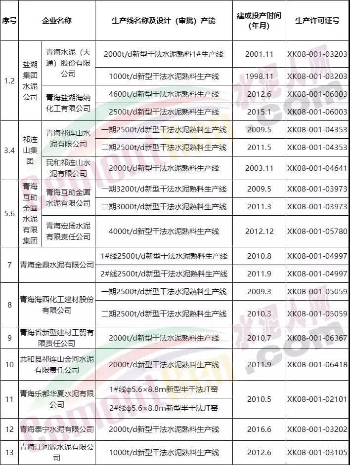 青海省水泥熟料生產(chǎn)線清單(截止2018年12月31日)