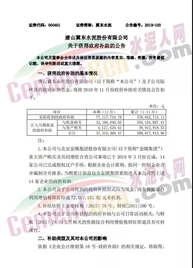 另外,從2019年1月-11月,冀東水泥及子公司累計計入當(dāng)期損益與收益相關(guān)的政府補(bǔ)助55010.5萬元,其中與日常活動相關(guān)的政府補(bǔ)助54515.26萬元,計入其他收益;與日常活動無關(guān)的政府補(bǔ)助495.24元,計入營業(yè)外收入。1-11月累計實(shí)際收到的政府補(bǔ)助為5.99億元。