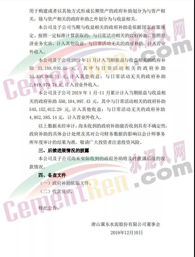 冀東水泥表示,以上數(shù)據(jù)未經(jīng)審計,尚未收到的政府補(bǔ)助能否收到具有不確定性, 政府補(bǔ)助的具體會計處理及其對公司財務(wù)數(shù)據(jù)的影響以會計師事務(wù)所年度審計的結(jié)果為準(zhǔn)。