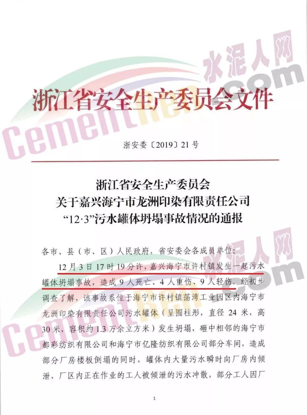 經(jīng)初步調(diào)查了解,該事故系位于海寧市許村鎮(zhèn)蕩灣工業(yè)園區(qū)內(nèi)海寧市龍洲印染有限責任公司污水罐體(呈圓柱形,直徑24米,高30米,容積約1.3萬立方米)發(fā)生坍塌,砸中相鄰的海寧市都彩紡織有限公司和海寧市億隆紡織有限公司部分車間,造成部分廠房樓板倒塌的同時,罐體內(nèi)大量污水瞬時向廠房內(nèi)傾泄,廠區(qū)內(nèi)正在作業(yè)的工人被傾泄的污水沖散,部分工人因廠區(qū)內(nèi)屯放的布匹坍倒受壓,造成人員傷亡。目前,事故原因正在進一步調(diào)查中。