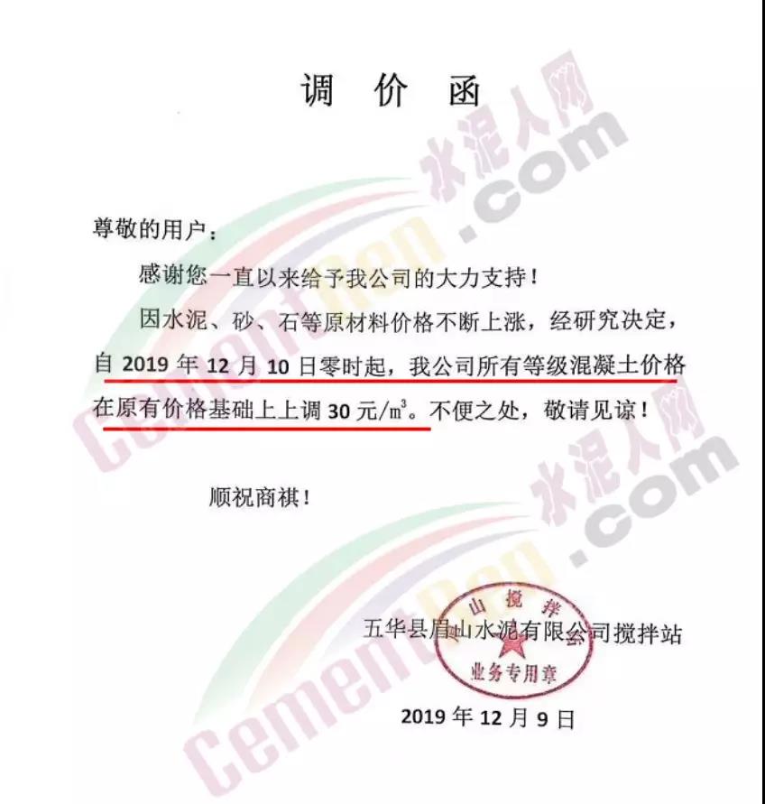 同期,因水泥、砂、石等原材料價格不斷上漲,經研究決定 自12月10日零時起,公司所有等級混凝土價格在原有價格基礎上上調30元/方。