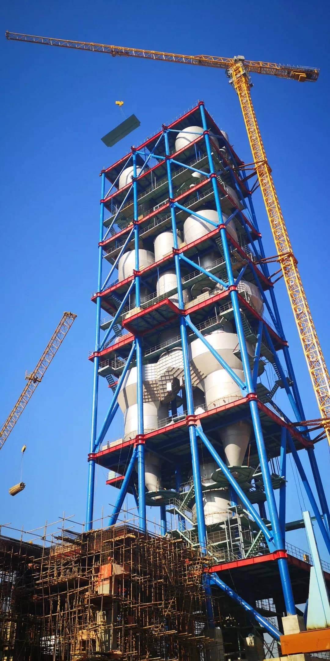 回轉(zhuǎn)窯窯尾是項(xiàng)目建設(shè)中的最高建筑,主要包括預(yù)熱器、分解爐等大型設(shè)備,在整個工藝流程中擔(dān)負(fù)生料喂入旋風(fēng)筒、循環(huán)預(yù)熱分解后入窯的重要作用。8月18日貴州尖峰項(xiàng)目的設(shè)備安裝“第一吊”,也是從窯尾開始的。