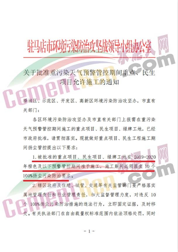 12月6日,河南省駐馬店市環境污染防治攻堅戰領導小組辦公室發布了《關于批準重污染天氣預警管控期間重點、民生項目允許施工的通知》稱,根據各區環境污染防治攻堅辦及市有關部門報需在重污染天氣預警管控期間施工的重點項目、民生項目、綠牌工地,已經在市政府批準,請貫徹落實。具體重點項目、民生工程施工期間揚塵管控要求。文件全文如下: