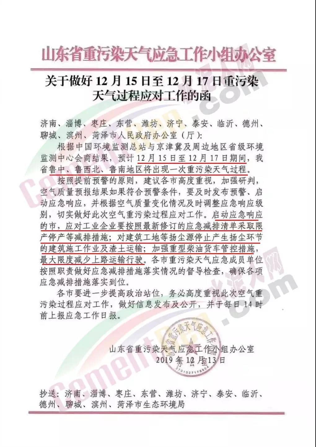 日前,山東省重污染天氣應急工作小組辦公室發布《關于做好12月15日至12月17日重污染天氣過程應對工作的函》稱提到12月15日至12月17日期間山東省魯中、魯西北、魯南地區將出現一次重污染天氣過程 。按照提前預警的原則,建議濟南、淄博、棗莊、東營、濰坊、濟寧、泰安、臨沂、德州、聊城、濱州、荷澤市12個城市,高度重視并加強研判,空氣質量預報結果如果符合預警條件,要及時發布預警、啟動應急響應,并根據空氣質量變化情況及時調整應急響應級別,切實做好此次空氣重污染過程應對工作。此次預警,山東省300多家水泥熟料和粉磨站企業將要面臨新一輪的停限產。