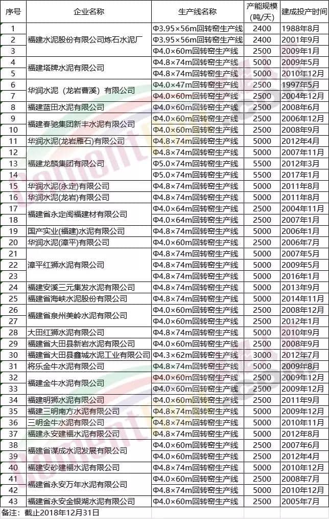 福建省水泥熟料生產線清單