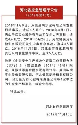 前不久,河北省應急管理廳發布2019年第13號公告稱,2018年1月9日發生在河北省張家口市涿鹿金隅水泥有限公司發布坍塌事故,造成6人死亡。依據《企業安全生產標準化評審工作管理辦法(試行)》規定,撤銷涿鹿金隅水泥有限公司安全生產標準化二級企業稱號。