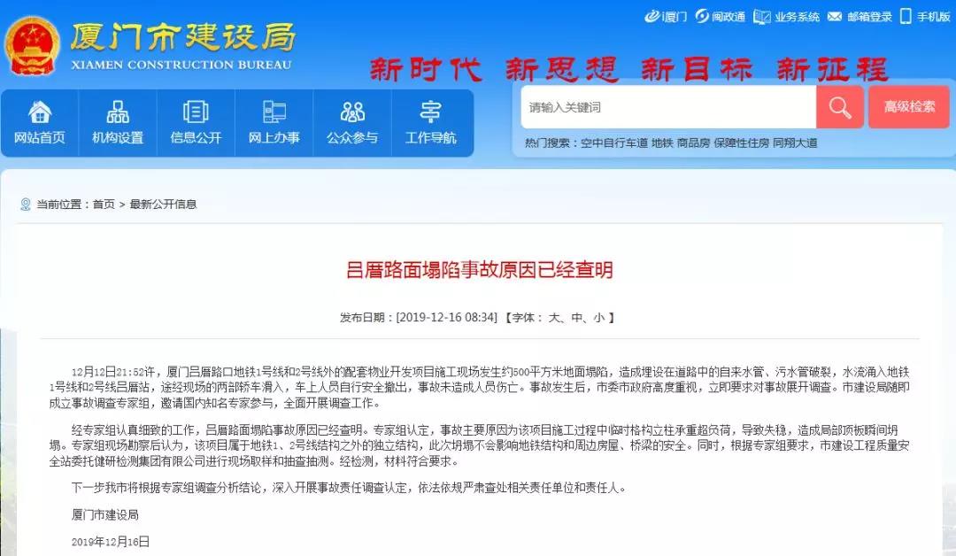 12月16日上午,廈門市建設局發布通報稱,12月12日21點52分左右,廈門呂厝路口地鐵1號線和2號線外的配套物業開發項目施工現場發生約500平方米地面塌陷,目前塌陷事故原因已查明。