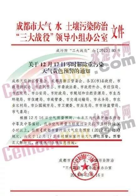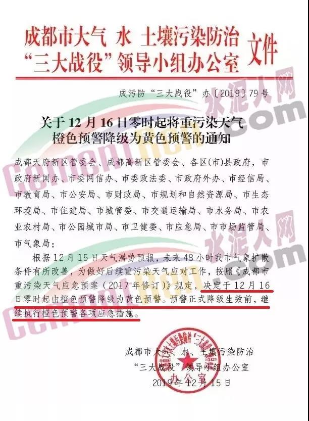 15日,成都市大氣、水、土壤污染防治“三大戰(zhàn)役”領(lǐng)導(dǎo)小組辦公室曾發(fā)布通知稱自12月16日零時(shí)起由橙色預(yù)警降級(jí)為黃色預(yù)警。