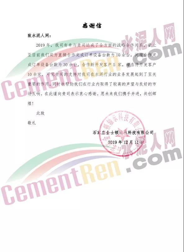 12月11日,收到來(lái)自石家莊金士頓軸承科技有限公司發(fā)來(lái)的《感謝信》稱,截止目前,在與水泥人合作下,直接合作完成訂單設(shè)備臺(tái)數(shù)10余臺(tái),間接合作完成訂單設(shè)備臺(tái)數(shù)為30余臺(tái),合作新開發(fā)客戶5家,潛在待開發(fā)客戶10余家,水泥人網(wǎng)在水泥行業(yè)的業(yè)務(wù)發(fā)展起到了至關(guān)重要的作用,同時(shí)也幫助石家莊金士頓軸承科技有限公司在行業(yè)內(nèi)取得了較高的聲望與良好的市場(chǎng)反響。