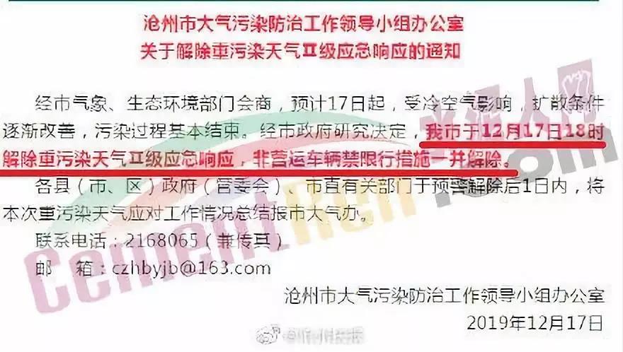 同期,滄州市大氣污染防治工作領導小組辦公室發布了《關于解除重污染天氣Ⅱ級應急響應的通知》稱,經市氣象、生態環境部門會商,預計17日起,受冷空氣影響,擴散條件逐漸改善,污染過程基本結束。經市政府研究決定,滄州市于12月17日18時解除重污染天氣Ⅱ級應急響應 ,非營運車輛禁限行措施一并解除。各縣(市、區)政府(管委會)、市直有關部門于預警解除后1日內,將本次重污染天氣應對工作情況總結報市大氣辦。