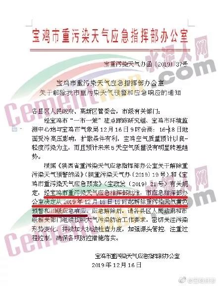 12月16日,寶雞市重污染天氣應急指揮部辦公室發布了《關于解除重污染天氣預警和應急響應的通知》稱,寶雞市空氣質量預計以良-輕度污染為主,而且預計未來5天工期質量沒有明顯轉差趨勢,經寶雞市重污染天氣應急指揮部批準,市應急指揮部辦公室決定從2019年12月16日16時起解除重污染天氣黃色預警。