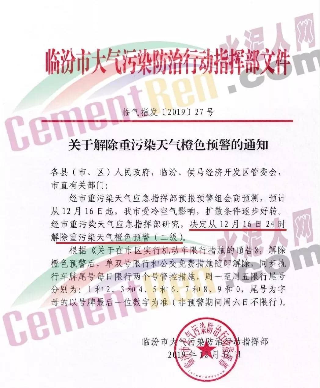 12月16日,臨汾市大氣污染防治行動指揮部發布了《關于解除重污染天氣橙色預警的通知》稱,經臨汾經市重污染天氣應急指揮部預報預警組會商預測,預計從12月16日起,我市受冷空氣影響,擴散條件逐步好轉。經市重污染天氣應急指揮部研究,決定從12月16日24時解除重污染天氣橙色預警(二級)。