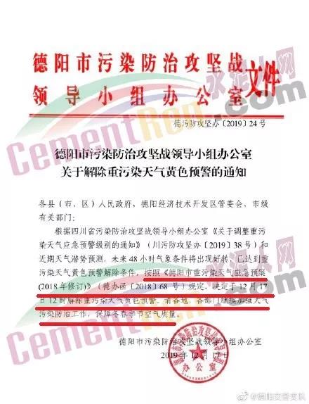 12月17日德陽市污染防治攻堅戰領導小組辦公室發布了《關于解除重污染天氣黃色預警的通知》稱,根據四川省污染防治攻堅戰領導小組辦公室《關于調整重污染天氣應急預警級別的通知》(川污防攻堅辦〔2019〕38 號)和近期天氣潛勢預測,未來 48 小時氣象條件將出現好轉,已達到重污染天氣黃色預警解除條件,按照《德陽市重污染天氣應急預案(2018 年修訂)》(德辦函〔2018〕68 號)規定,決定于 12 月 17日 12 時解除重污染天氣黃色預警。
