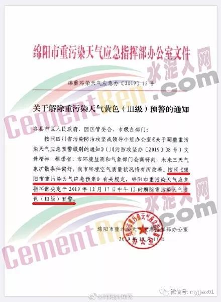 12月16日,綿陽市重污染天氣應急指揮部發布了《關于12月16日中午12時起將重污染天氣橙色預警降級為黃色預警的通知》,12月17日,重污染天氣應急指揮部發布《解除重污染天氣黃色預警》稱,按照《綿陽市重污染天氣應急預案》有關規定,綿陽市重污染天氣應急指揮部決定于2019年12月17日中午12時解除重污染天氣黃色(III級)預警。