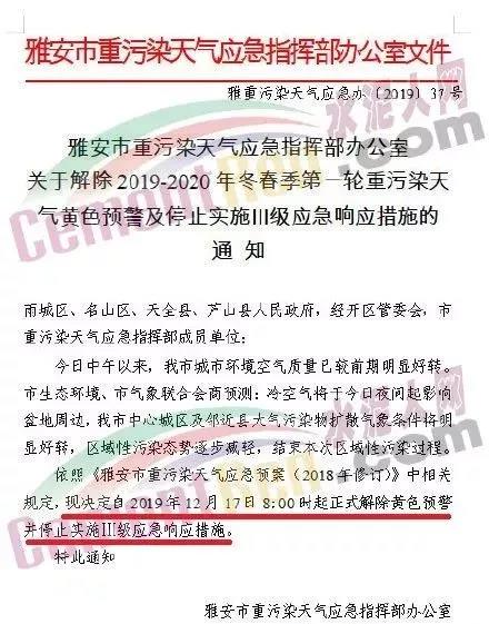 12月16日,雅安市重污染天氣應急指揮部辦公室發布了《關于解除重污染天氣黃色預警通知》稱,依照《雅安市重污染天氣應急預案(2018年修訂)》中相關規定,現決定自2019年12月17日8:00時起正式解除黃色預警并停止實施Ⅲ級應急響應措施。